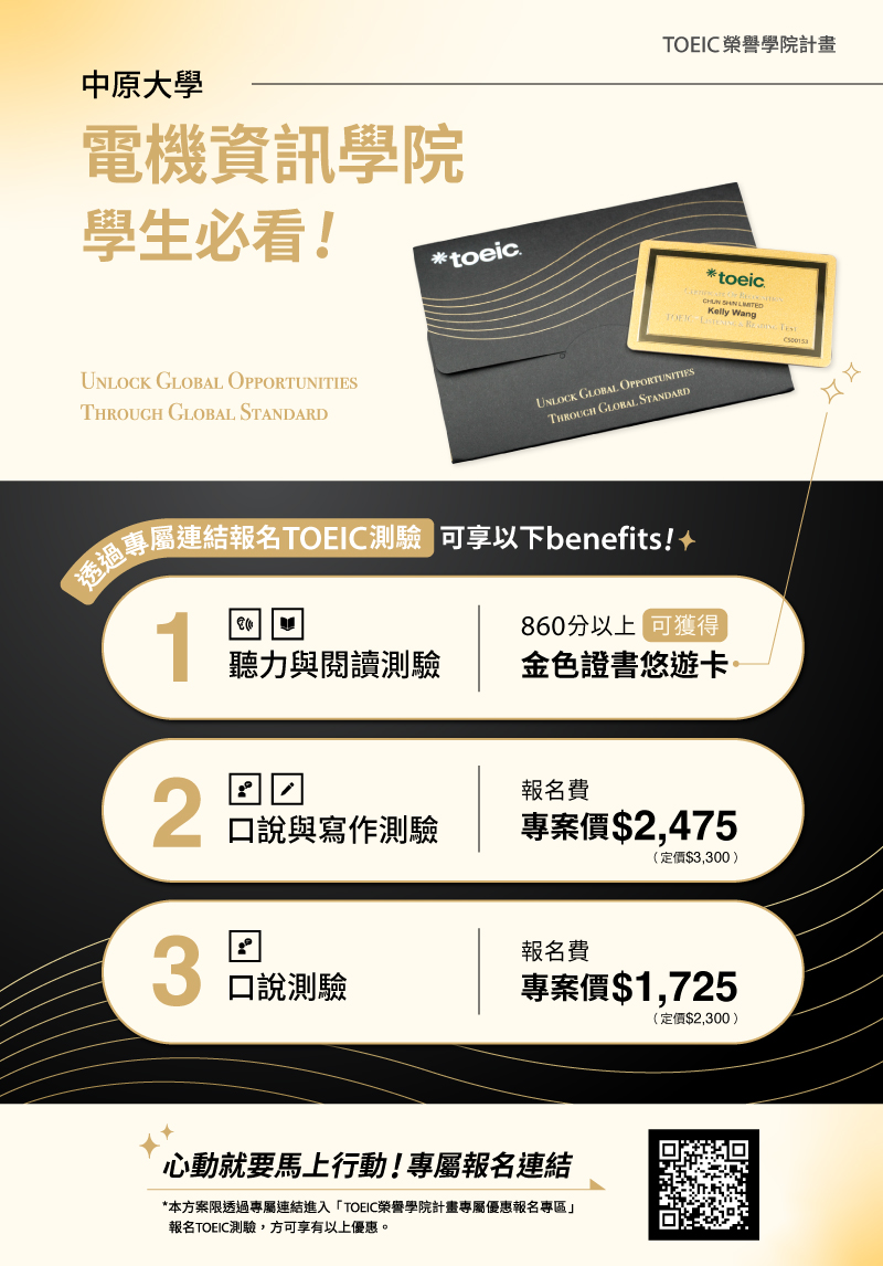 中原電資xTOEIC榮譽學院計畫來囉!2025-10-01/在: 雙語化課程, 一般公告 /通過: 邱培瑜中原大學電資學院與TOEIC簽訂榮譽學院計畫,只限電資學院學生有特殊優惠及獎勵! 詳情請點進QR CODE或以下網址中查看哦! <點選網址> https://eecs.cycu.edu.tw/wp-content/uploads/2025/10/TOEIC榮譽學院下半年考期EDM版_中原大學電機資訊學院.jpg 1146 800 邱培瑜 /wp-content/uploads/2023/11/電資學院logo-2.png 邱培瑜2025-10-01 14:04:072025-10-20 14:07:38中原電資xTOEIC榮譽學院計畫來囉!