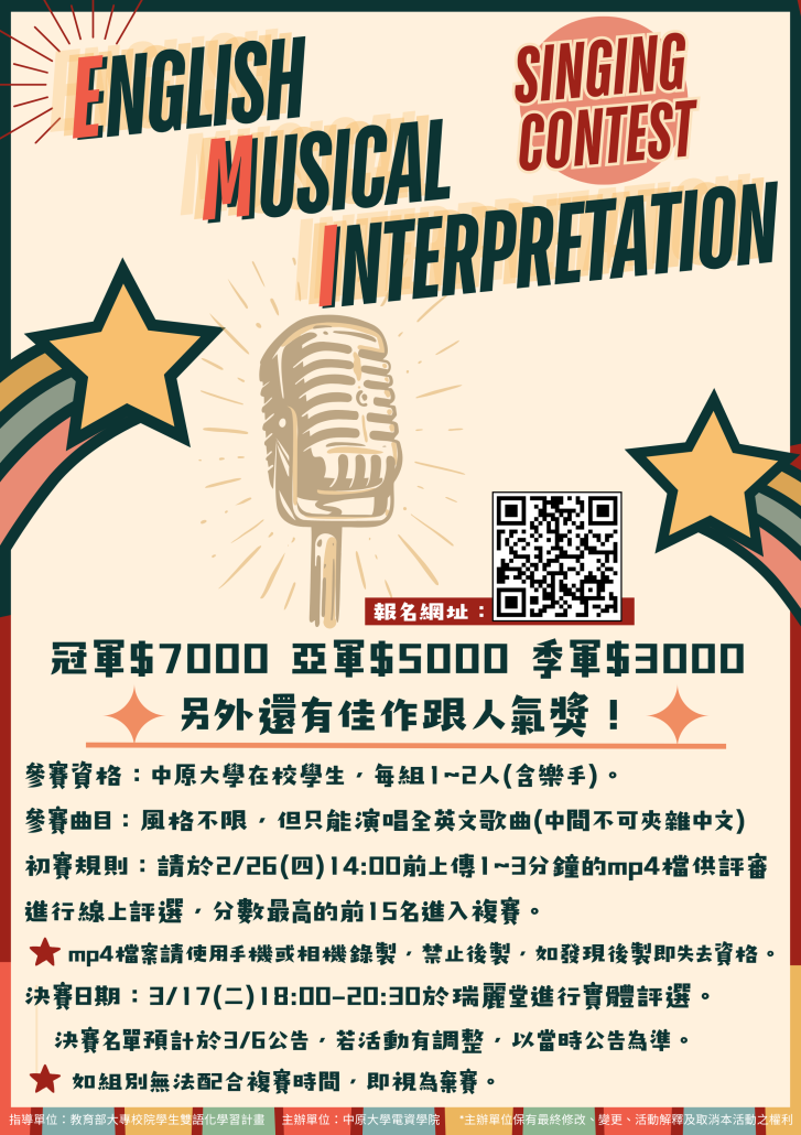 參賽資格:中原大學在校學生,每組1~2人(含樂手)